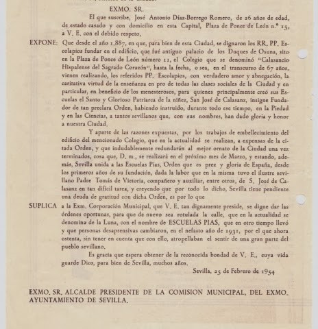 Algunos días después se solicita al Ayuntamiento la reposición de la rotulación de la calle de las Escuelas Pías que en 1931 fue cambiada por «personas desaprensivas» por el de Luna o de la Luna.