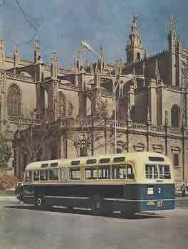 Ya por entonces están funcionando 17 líneas de autobuses. Aquí vemos un modelo Leyland de la linea 2, circular en sentido de las agujas del reloj pasando por el centro de la ciudad (Avdas. de Queipo de Llano y de José Antonio, Plaza Nueva, Tetuán, Velázquez, Campana, Santa María de Gracia, etc. hasta salir a la Macarena por calle Feria y dar la vuelta a la ronda histórica hasta llegar a calle San Fernando, Plaza de Calvo Sotelo,…)