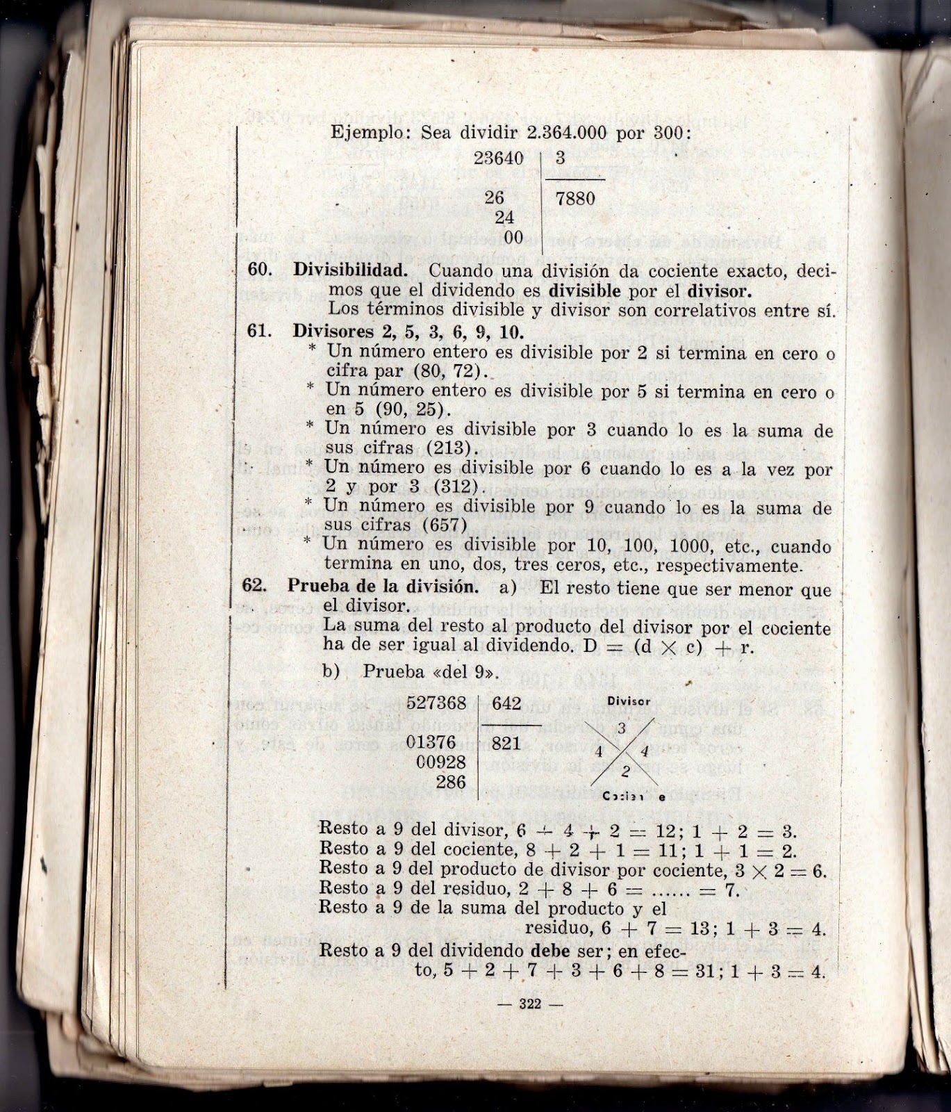 De entre sus páginas he seleccionado una de Aritmética, la 322, en la que se nos enseña cómo llevar a cabo con éxito la prueba del 9 en las operaciones de División.