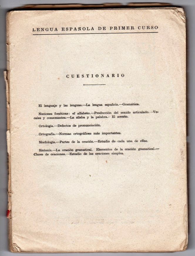 Aquí tenemos el de Lengua Española, sin portada. Por la contraportada verán que hasta entonces las «pastas» eran de cartoncillo, sin brillo.