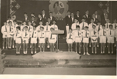 O por ejemplo la Escolanía. Aquí hay una imagen, del Curso ¿1960-61?, cantando en el Coro Conventual de la Iglesia de los Terceros. Al armonium D. Francisco Galán. Entre los niños, el primero a la derecha es Antonio Bellón Alcántara, que es quién envía la foto. Le sigue hacia la izquierda Gil Martín, Cuéllar de la Calle y Lucas Pérez Martín y en la tercera fila Francisco Miralles Sanchís. Cerca de él está Uribe, el segundo por la izquierda con gafas. En la primera fila están el segundo por la izquierda Serrano Urbano, detrás de él Martín Reyes y José María Cabeza Méndez que es el cuarto.